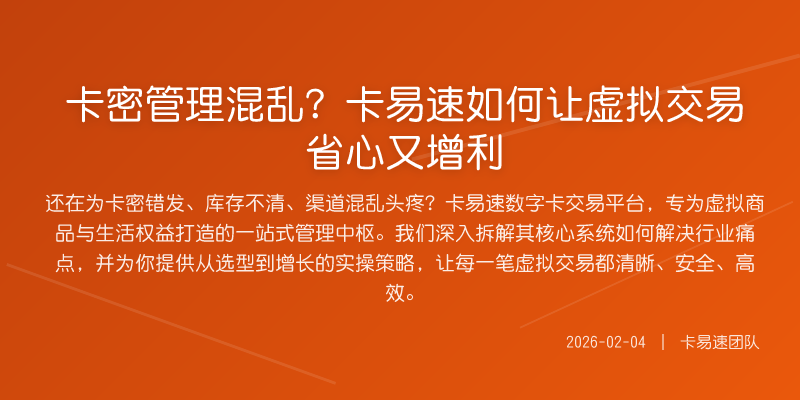 还在为卡密错发、库存不清、渠道混乱头疼?卡易速数字卡交易平台,专为虚拟商品与生活权益打造的一站式管理中枢。我们深入拆解其核心系统如何解决行业痛点,并为你提供从选型到增长的实操策略,让每一笔虚拟交易都清晰、安全、高效。