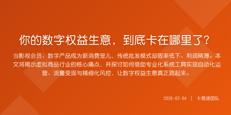 数字权益市场的蛋糕还在变大,但竞争的门槛正在从“资源获取”向“精细化运营能力”快速迁移。继续依赖手工作业,不仅身心俱疲,更会错失市场扩张的黄金窗口期。无论是考虑卡易速这类成熟解决方案,还是其他专业系统,核心是迈出第一步——用工具将你自己从繁琐重复的劳动中解放出来,把时间和精力聚焦在选品、供应链和客户关系这些真正创造高价值的事情上。当你的交易流程变得丝滑顺畅,风险被牢牢锁在笼子里,营销玩法可以随心组合时,你会发现,这门生意的天空,远比想象中更广阔。