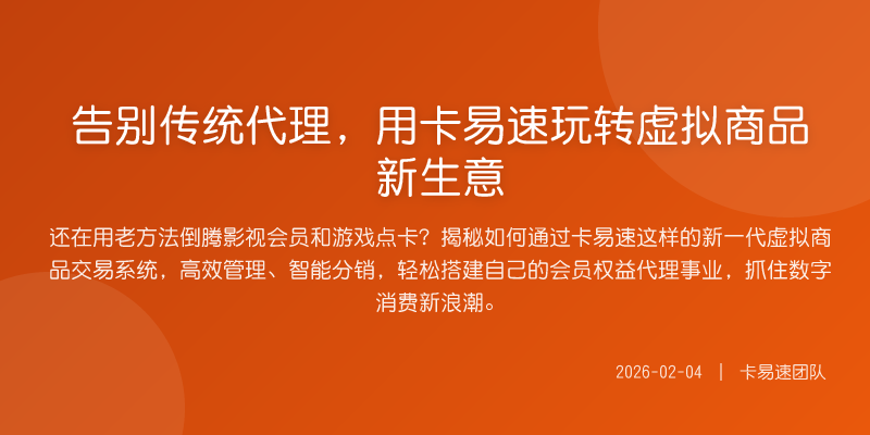 还在用老方法倒腾影视会员和游戏点卡?揭秘如何通过卡易速这样的新一代虚拟商品交易系统,高效管理、智能分销,轻松搭建自己的会员权益代理事业,抓住数字消费新浪潮。