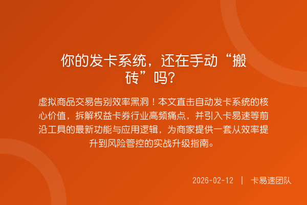 虚拟商品交易告别效率黑洞!本文直击自动发卡系统的核心价值,拆解权益卡券行业高频痛点,并引入卡易速等前沿工具的最新功能与应用逻辑,为商家提供一套从效率提升到风险管控的实战升级指南。