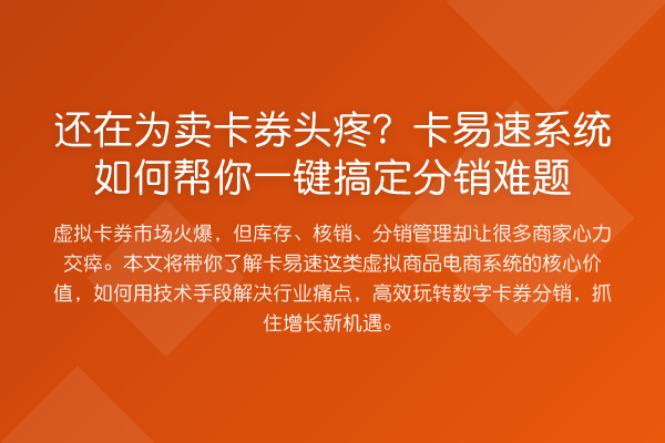 虚拟卡券市场火爆,但库存、核销、分销管理却让很多商家心力交瘁。本文将带你了解卡易速这类虚拟商品电商系统的核心价值,如何用技术手段解决行业痛点,高效玩转数字卡券分销,抓住增长新机遇。