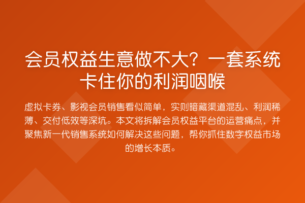 虚拟卡券、影视会员销售看似简单,实则暗藏渠道混乱、利润稀薄、交付低效等深坑。本文将拆解会员权益平台的运营痛点,并聚焦新一代销售系统如何解决这些问题,帮你抓住数字权益市场的增长本质。