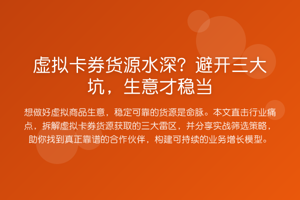 想做好虚拟商品生意,稳定可靠的货源是命脉。本文直击行业痛点,拆解虚拟卡券货源获取的三大雷区,并分享实战筛选策略,助你找到真正靠谱的合作伙伴,构建可持续的业务增长模型。