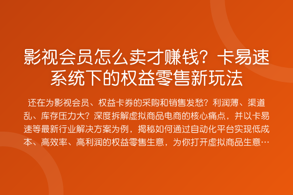 还在为影视会员、权益卡券的采购和销售发愁?利润薄、渠道乱、库存压力大?深度拆解虚拟商品电商的核心痛点,并以卡易速等最新行业解决方案为例,揭秘如何通过自动化平台实现低成本、高效率、高利润的权益零售生意,为你打开虚拟商品生意的正确思路。