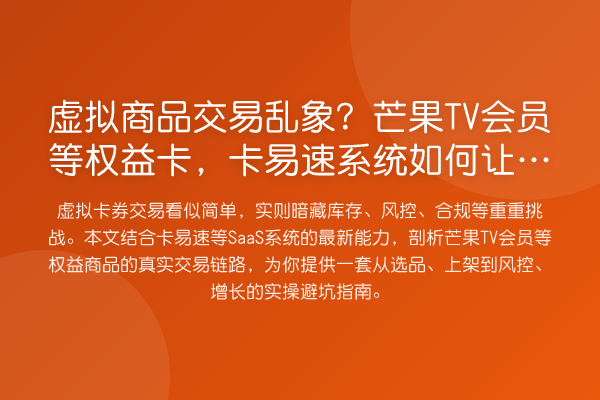 虚拟卡券交易看似简单,实则暗藏库存、风控、合规等重重挑战。本文结合卡易速等SaaS系统的最新能力,剖析芒果TV会员等权益商品的真实交易链路,为你提供一套从选品、上架到风控、增长的实操避坑指南。