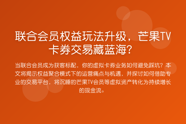 当联合会员成为获客标配,你的虚拟卡券业务如何避免踩坑?本文将揭示权益聚合模式下的运营痛点与机遇,并探讨如何借助专业的交易平台,将沉睡的芒果TV会员等虚拟资产转化为持续增长的现金流。
