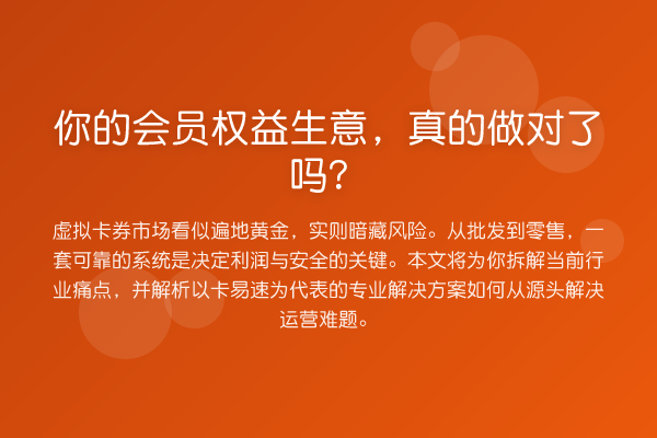 虚拟卡券市场看似遍地黄金,实则暗藏风险。从批发到零售,一套可靠的系统是决定利润与安全的关键。本文将为你拆解当前行业痛点,并解析以卡易速为代表的专业解决方案如何从源头解决运营难题。